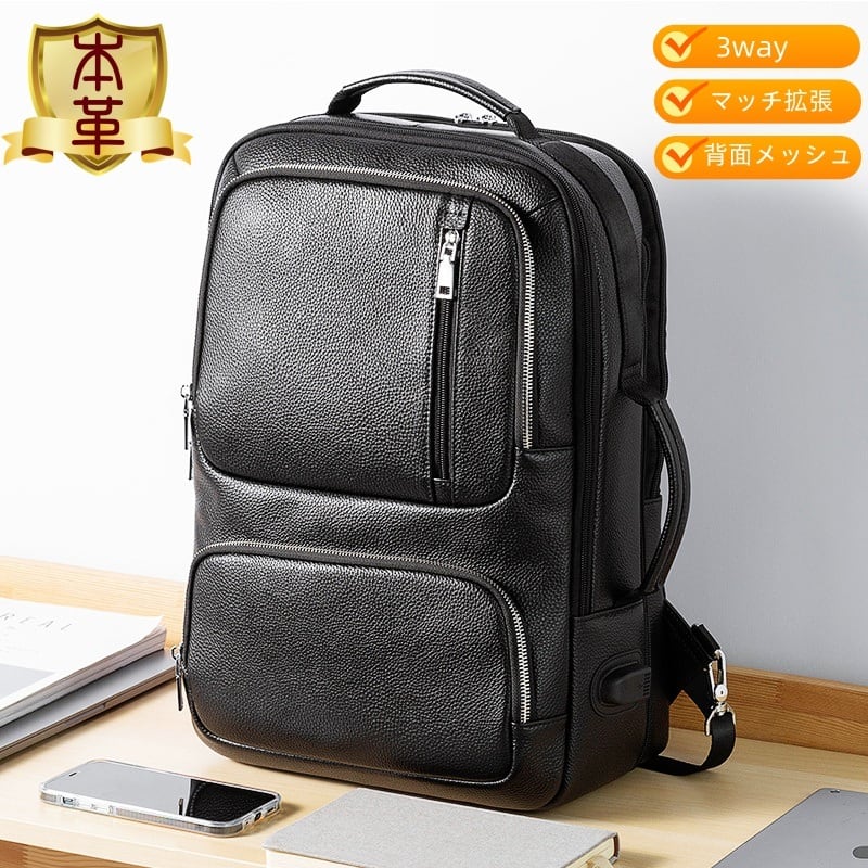 本革ビジネスリュック 3WAY マチ拡張 大容量 牛革使用 撥水加工 ビジネスバッグ リュックサック 15.6インチ ワイド A4サイズ書類収納 メンズ レディース 送料無料 プレゼント 父の日 266747 | 3Qee.com